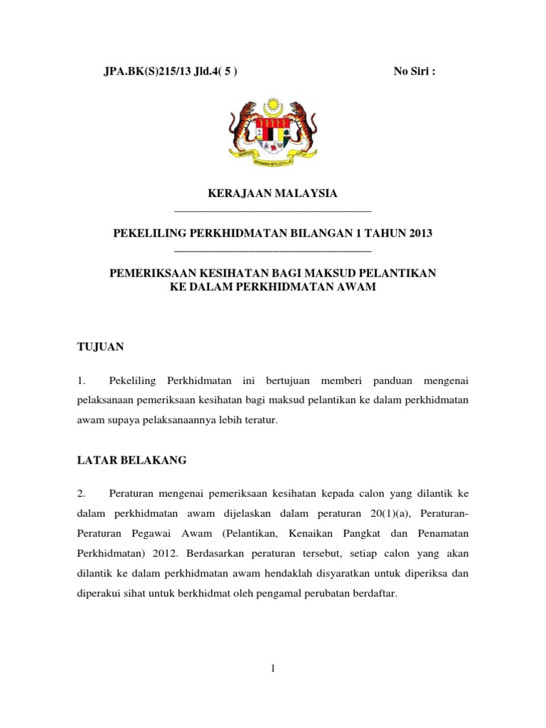 Pemeriksaan yang dilakukan adalah seperti dalam jadual di bawah. Written on sunday july 19 2020. 1 2013 borang permohonan pemeriksaan perubatan untuk pelantikan ke dalam perkhidmatan awam pemohon hendaklah mengisi maklumat di bahagian a b dan dan menyerahkan borang ini c berserta surat tawaran pelantikan kepada pengamal perubatan berdaftar sebelum pemeriksaan perubatan dibuat. Terima kasih rakyat malaysia kerana terus mematuhi sop yang ditetapkan kerajaan dan saranan kesihatan oleh kkm.