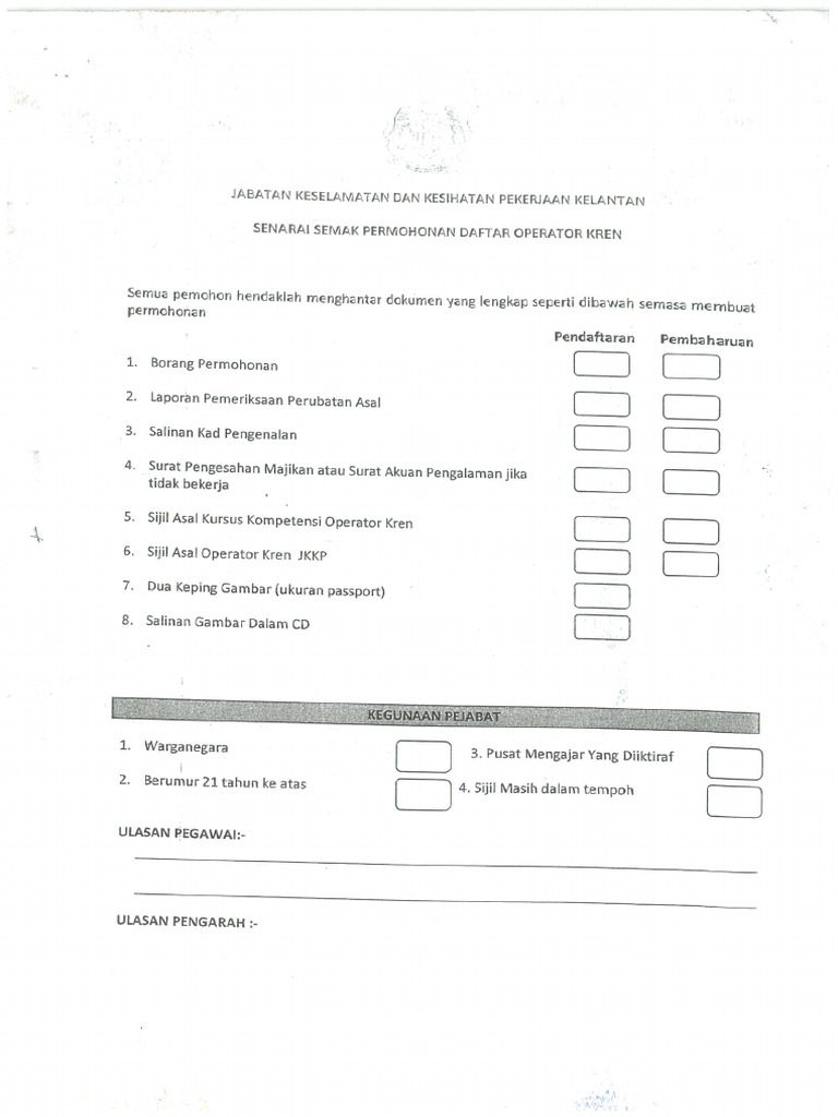 Menteri sumber manusia mengumumkan bahawa semua operator kren dikehendaki mendaftar dengan jabatan keselamatan dan kesihatan pekerjaan sebelum dibenarkan mengendalikan kren. Klik butang muat turun borang kesihatan.