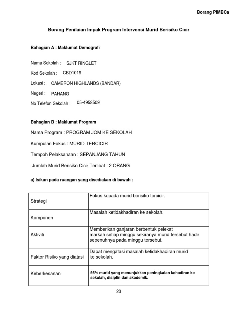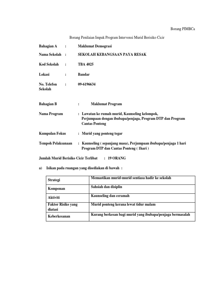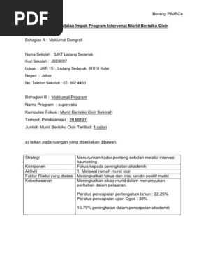 Borang penilaian impak program intervensi murid berisiko cicir. 6 3 7 mengumpul borang penilaian impak program intervensi murid berisiko cicir borang pimbca daripada sekolah dan membuat rumusan dalam borang penilaian impak program intervensi murid berisiko borang pimbcb untuk dihantar kepada jpn sebelum atau pada 1 oktober pada setiap tahun. Program immersion 2 0 ambilan 11. 11 2 memastikan program intervensi murid berisiko cicir dijalankan mengikut garis panduan yang dikeluarkan oleh kpm. 1 2 3 menjalankan menyimpan penilaian impak intervensi yang rekod program intervensi bersesuaian murid berisiko cicir merekod modul intervensi kehadiran murid borang pimbc murid berisiko diserahkan kepada cicir akan borang gpk hem setelah dibekalkan kehadiran murid selesai intervensi 6.