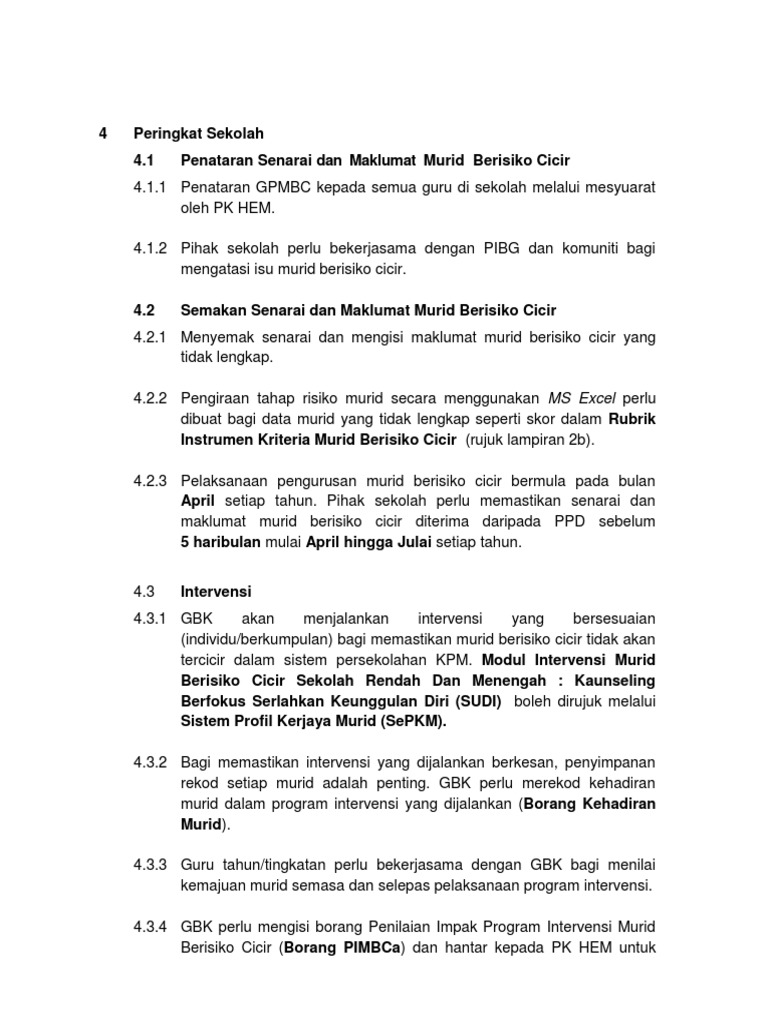 Pelaksanaan urusan murid berisiko cicir di sekolah. Bil nama borang tanggungjawab 1 kehadiran murid gbk 2 pimbca gbk 3 pimbcb ppd program intervensi murid berisiko cicir. Daya tumpuan murid sebelum intervensi. Pengetua guru besar dan kaunselor sekolah guru yang menjalankan tugas kaunselor.