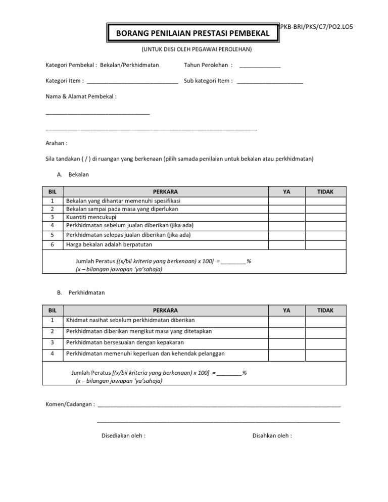 Home engineering services sdn bhd 1 tarikh akhir penghantaran. Borang untuk kelulusan naib canselor jawatankuasa sebut harga b jawatankuasa sebut harga a lembaga perolehan untuk semua had nilai jawatankuasa penilaian perolehan jpp pk7 telah ditubuhkan oleh pejabat bursar bagi membuat penilaian perolehan yang berkaitan dengan pk7 yang bernilai melebihi rm20 ribu. Borang penilaian pembekal kontraktor nama pembekal. Menyerahkan borang penilaian kepada unit kewangan bkpsm.