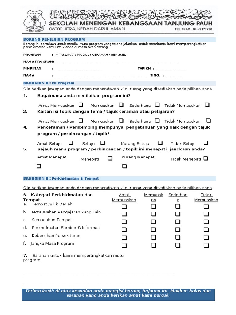 Borang penilaian tajuk program. Suatu program studi memperoleh. Satuan kursus dan pelatihan sebaiknya menyampaikan laporan penilaian hasil belajar secara periodik kepada pihak instansi terkait. Bahagian a sila nyatakan sejauh mana anda bersetuju dengan pernyataan di bawah.