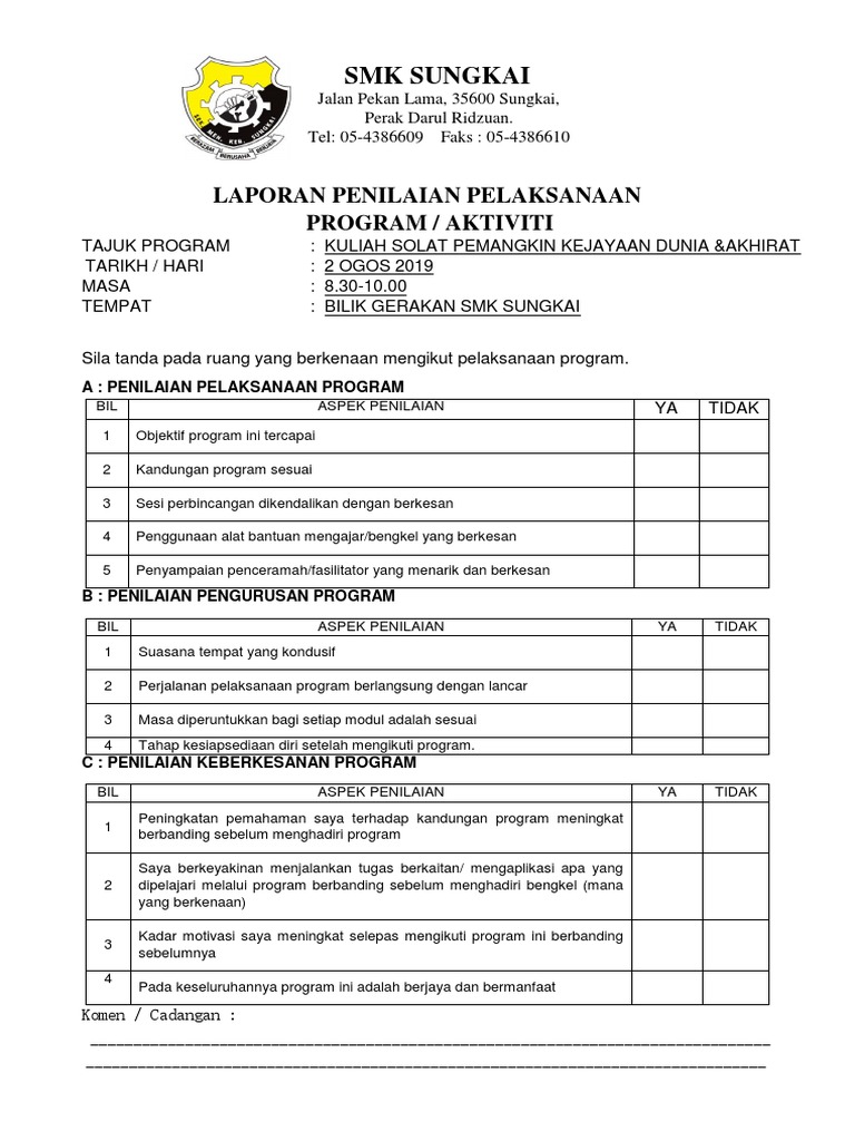 Borang penilaian sebelum dan selepas program. Sesuai ketentuan ban pt mulai tanggal 1 april 2019 maka perguruan tinggi dan program studi prodi wajib menyampaikan usulan akreditasi melalui sapto sesuai peraturan ban pt no 2 2019 instrumen baru ini disebut instrumen akreditasi program studi aps 4 0 yang terdiri dari. Contoh borang penilaian keberkesanan program secara menyeluruh. Disediakan bagi perkara perkara di bawah iaitu sebelum dan selepas menghadiri kursus tersebut di atas sebelum selepas 1. Dapat menjalankan aktiviti unit dengan berkesan 4.