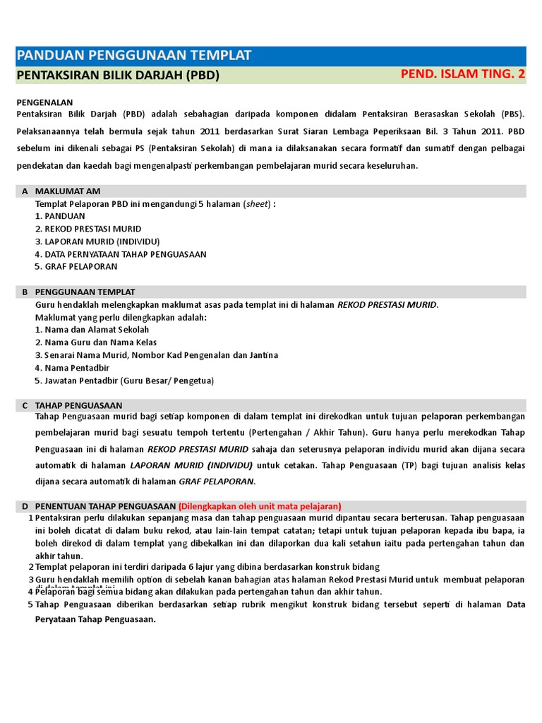 Templat pelaporan pbd tahun 5 adalah sebahagian daripada komponen di dalam pentaksiran berasaskan sekolah pbs tahun 5 pelaksanaannya telah bermula sejak tahun 2011 berdasarkan surat siaran lembaga peperiksaan bil. Pentaksiran sekolah berfungsi sebagai pentaksiran untuk pembelajaran assessment for learning dan pentaksiran tentang pembelajaran assessment of learning. Ia bersifat formatif bagi membolehkan guru guru membuat doiagnostik terhadap kemajuan murid serta murid pula dapat diukur ansur maju kemajuan mereka. Templat fail pelaporan pentaksiran bilik darjah pbd untuk tahun 3 2019 telah pun dikeluarkan oleh bahagian pembangunan kurikulum.