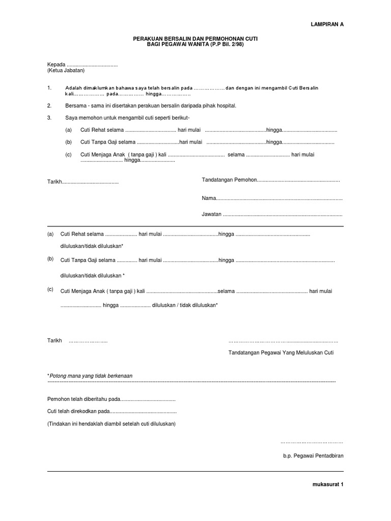 Borang permohonan cuti bersalin 2 2bc6 03b perhatian. 1 lampiran b jpa saraan 223 5 4 3 jld. Pegawai hendaklah mengemukakan perakuan bersalin dan permohonan cuti kepada ketua jabatan bagi tujuan diluluskan kemudahan cuti bersalin. Borang permohonan cuti tanpa gaji dan cuti separuh gaji bagi pegawai latihan siswazah houseman.