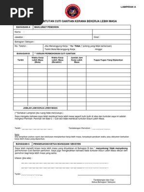 Pengumpulan cuti bagi tujuan gantian cuti rehat adalah mengikut peruntukan para 21 1 peraturan pencen 1980 pekeliling perkhidmatan dan perintah am bab c. Bersama ini dikemukakan tuntutan permohonan mengumpul cuti gantian keluar pejabat bagi kerja kerja lebih masa yang telah saya lakukan sepanjang bulan 20. Pegawai yang meluluskan cuti disahkan kerja kerja lebih masa telah dibuat pada tarikh tarikh seperti diatas. Kelulusan oleh pengarah permohonan cuti gantian di atas adalah diluluskan tidak diluluskan.