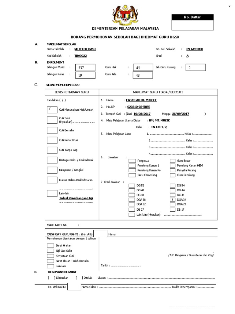 Borang permohonan guru ganti kgsk. Berikut dikongsikan tatacara permohonan jawatan kosong guru ganti 2020 untuk lepasan spm stpm diploma dan ijazah sarjana muda yang tidak memiliki latihan ikhtisas perguruan seperti pismp. Posted 1st november 2009 by kgsk manjung. Permohonan guru ganti kgsk pihak sekolah perlu mendapat kelulusan dari pihak ppd sebelum meminta calon cadangan sekolah untuk memulakan perkhidmatan. Kementerian pelajaran malaysia borang permohonan guru ganti kgsk a.