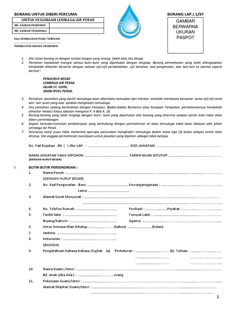 Borang permohonan kerja lembaga air perak. Iklan permohonan jawatan kosong terkini di bawah merupakan maklumat kekosongan jawatan yang ditawarkan oleh majikan terlibat. Lembaga perumahan hartanah perak aras g bangunan perak darul ridzuan jalan panglima bukit gantang wahab 30000 ipoh perak. Sila pastikan borang permohonan diisi dengan lengkap dan mengikuti segala arahan yang ditetapkan sebelum menghantar ke alamat berikut pengurus besar lembaga air perak jalan st. 6 28 pm in perak.