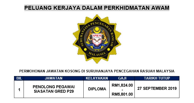 Pegawai siasatan terbuka lelaki wanita 2. Kerja kosong terkini sprm kepada seluruh rakyat malaysia yang berminat dan mempunyai jati diri yang cermerlang anda diperlawa untuk segera membuat permohonan bagi mengisi kekosongan jawatan yang ditawarkan di suruhanjaya pencegahan rasuah malaysia sprm. Borang permohonan program ceramah. Untuk memohon pastikan anda rujuk syarat pengambilan bidang tugas jawatan dan lokasi kekosongan jawatan terlebih dahulu.
