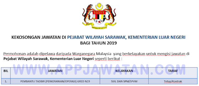 Jawatan kosong terkini di pejabat wilayah sarawak kementerian luar negeri mempelawa warganegara malaysia yang berkelayakan dan berumur tidak kurang daripada 18 tahun pada tarikh tutup iklan jawatan untuk memohon jawatan seperti senarai dibawah kepada sesiapa yang berminat bekerja di sektor kerajaan dan swasta yang berkelayakan dipelawa untuk memohon sekarang juga iaitu. Jawatan kosong di kementerian luar negeri malaysia mempelawa warganegara malaysia yang berkelayakan dan berumur tidak kurang daripada 18 tahun pada tarikh tutup iklan jawatan untuk memohon jawatan seperti senarai dibawah kepada sesiapa yang berminat bekerja di sektor kerajaan dan swasta yang berkelayakan dipelawa untuk memohon sekarang juga iaitu. Hakcipta terpelihara 2010 bahagian sumber manusia kementerian kesihatan malaysia. 16 07 2020 189 malaysian tabligh members in india critical says hisham.