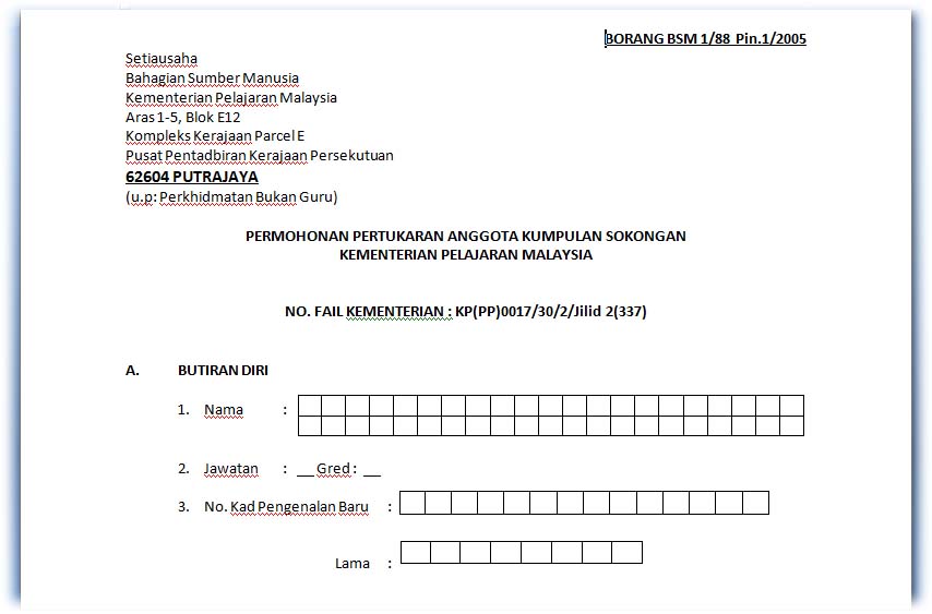 Borang permohonan pertukaran kakitangan kumpulan sokongan kementerian kerja raya. I borang permohonan hendaklah dilengkapkan dan permohonan yang tidak melalui ketua jabatan tidak akan dipertimbangkan. Borang cadangan pertukaran kakitangan kumpulan sokongan kj 1 92 borang cadangan menukarkan kakitangan kumpulan sokongan kj 2 92 jadual perwakilan kuasa urusan kewangan peringkat jkr negeri dan daerah. Borang permohonan pemangkuan kump. Jadual perwakilan kuasa urusan kewangan peringkat ibu pejabat kementerian.