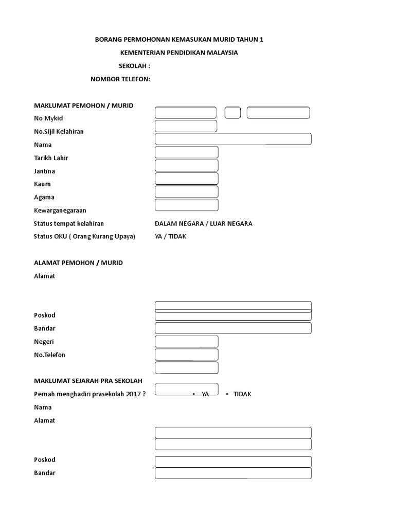 Borang Permohonan Tahun 1 Kementerian Pendidikan Malaysia