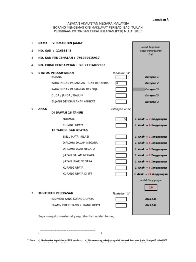 Sila pastikan tuan menggunakan borang yang betul untuk setiap potongan pcb. Borang ini hendaklah diisi oleh pekerja dan satu salinan diserahkan kepada majikan tanpa resit atau dokumen sokongan untuk tujuan pelarasan pengiraan pcb. Borang tuntutan potongan dan rebat individu bagi tujuan potongan cukai bulanan pcb kaedah kaedah cukai pendapatan potongan daripada saraan 1994 borang ditetapkan di bawah seksyen 152 akta cukai pendapatan 1967 perbelanjaan perubatan ibu bapa sendiri ke atas penyakit yang disahkan oleh pengamal perubatan. Majikan dinasihatkan supaya membaca kandungannya dengan teliti sebelum membuat potongan cukai berkenaan.