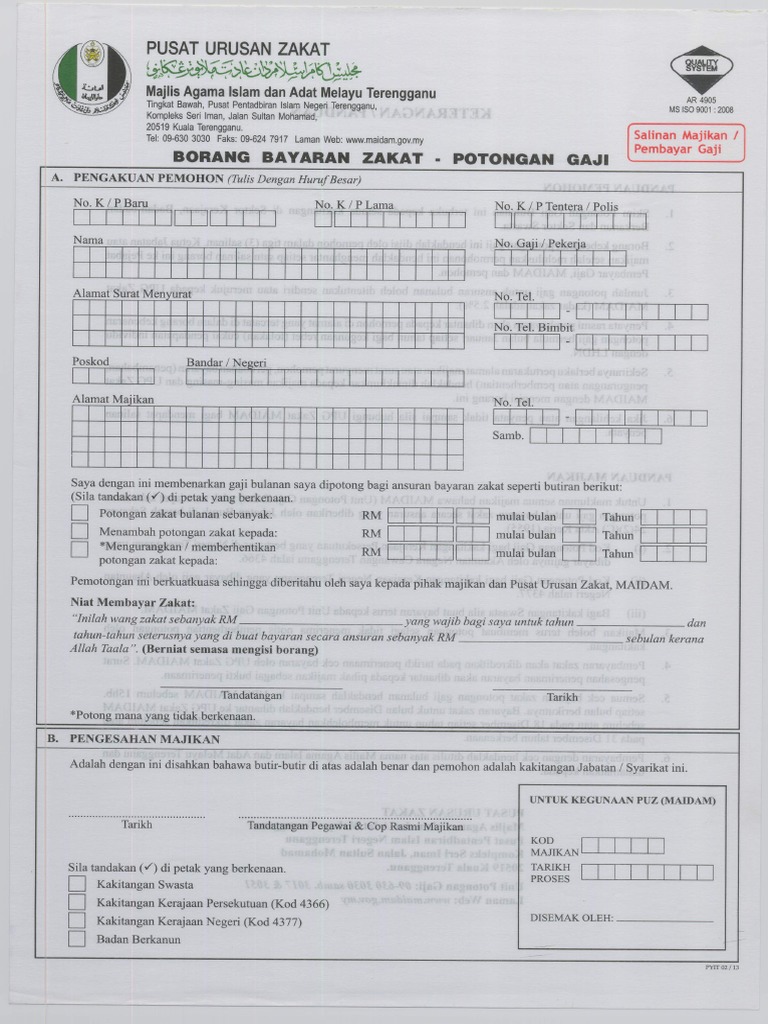 Borang potongan zakat maidam. Borang permohonan bayaran balik 2 8. Borang zakat potongan gaji. Borang bantuan kebajikan anak yatim. Borang mengikuti latihan kemahiran maidam.