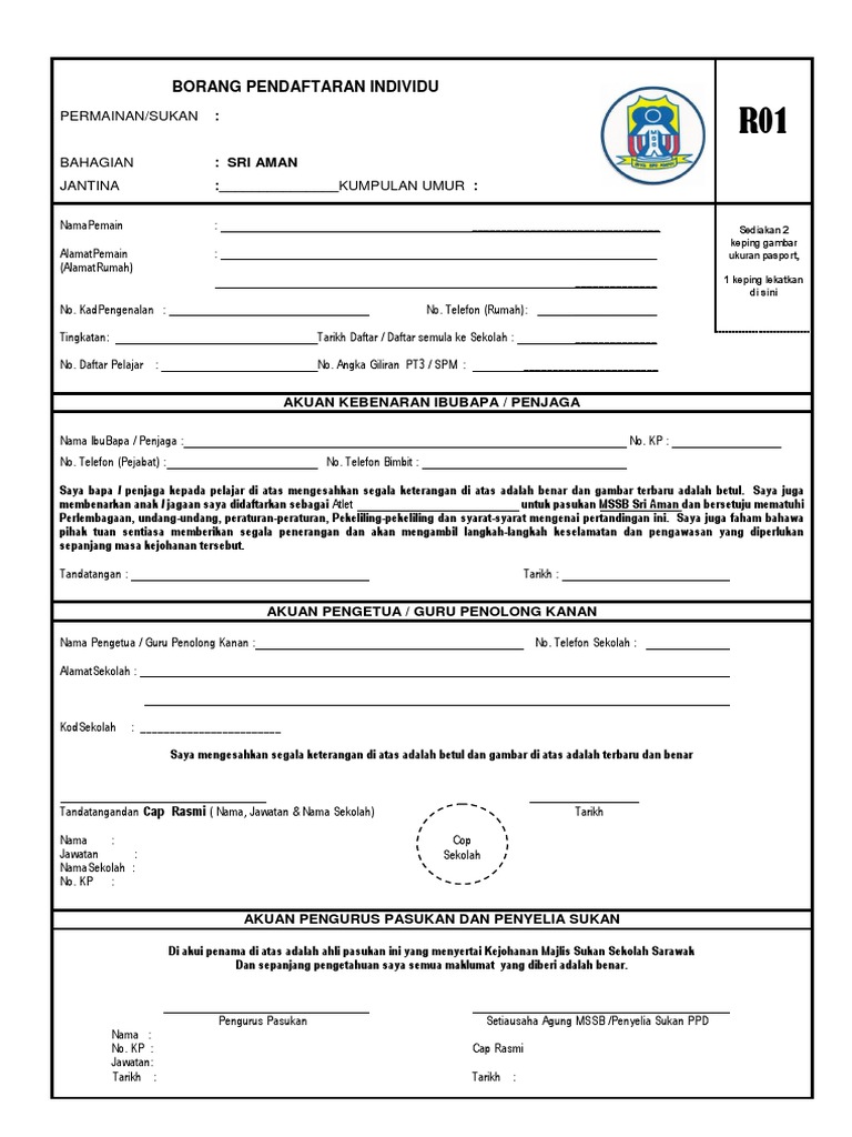 Pastikan bahagian gambar saiz pasport asli ori tandatangan guru besar pengetua sekolah serta cop rasmi sekolah telah diisi lengkapkan sebelum diserah. Borang akuan ibu bapa terkini borang ro1 mssm terkini borang mo1 mssm terkini borang r02 mssm mss sarawak. Sila gunakan borang yang betul. Borang r01 pendaftaran pemain mssm borang pendaftaran pemain r01.