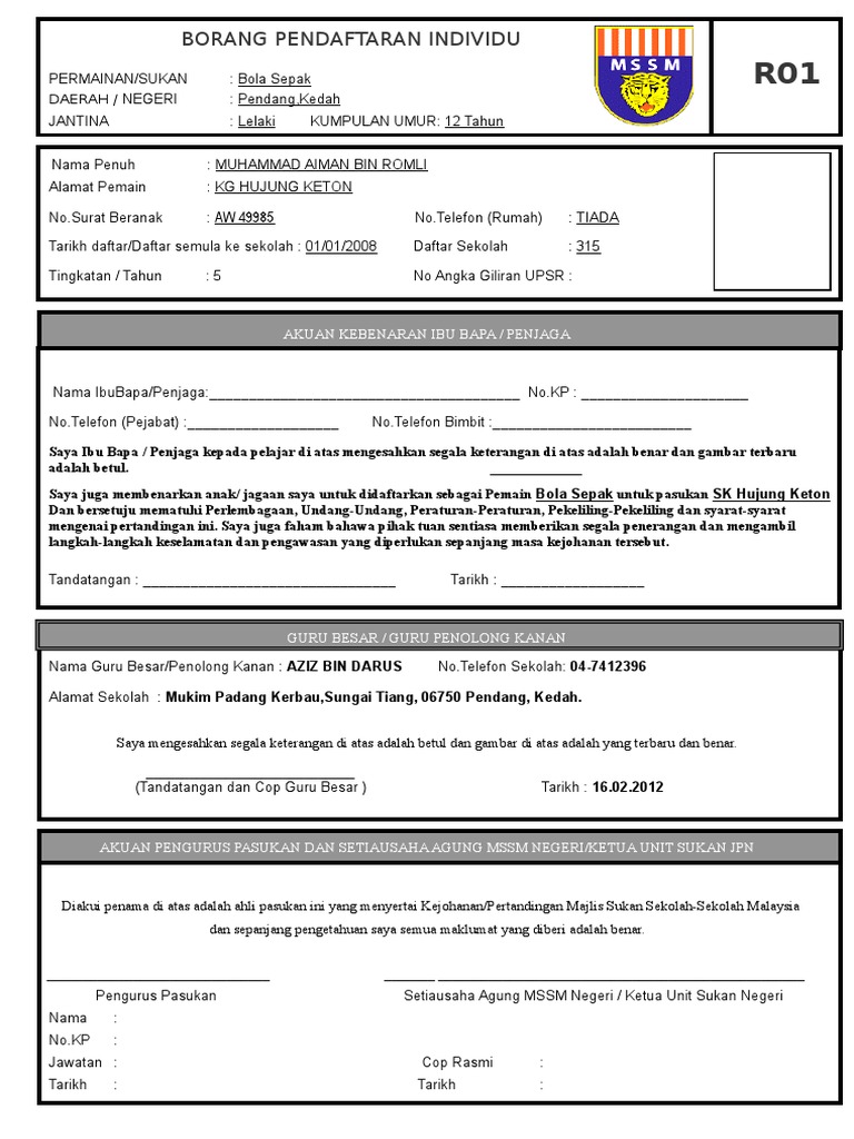 Tarikh daftar daftar semula ke sekolah. Borang pendaftaran m01 m02 r01 dan r02 untuk guru. Maklumat atlet pastikan bahagian bahagian di bawah. Saya juga mengakui bahawa penama di atas telah mendapat kebenaran ibubapa penjaga melalui borang kebenaran ibubapa penjaga mengikut surat pekeliling ikhtisas bil.