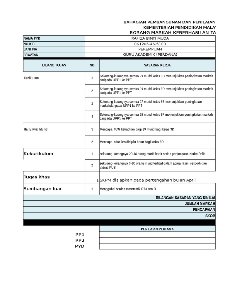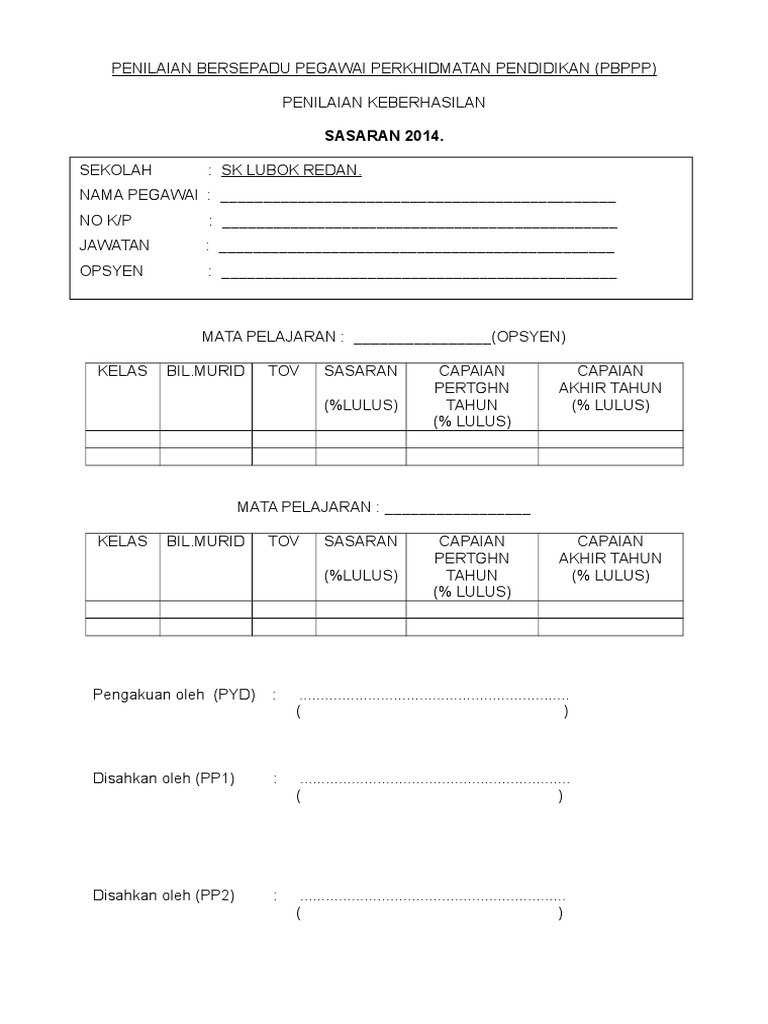 Borang sasaran keberhasilan. Mycikgu 02 february 26 2020. Penilaian bersepadu pegawai perkhidmatan pendidikan pbppp terdiri daripada komponen penilaian kompetensi dan potensi dan komponen keberhasilan. Bahagian pembangunan dan penilaian kompetensi kementerian pendidikan malaysia penetapan sasaran dan pencapaian keberhasilan tahun 2015. Bilangan sasaran ataupun minimun sasaran yang ditetapkan adalah berbeza mengikut pentadbiran sekolah dan pejabat pendidikan daerah.