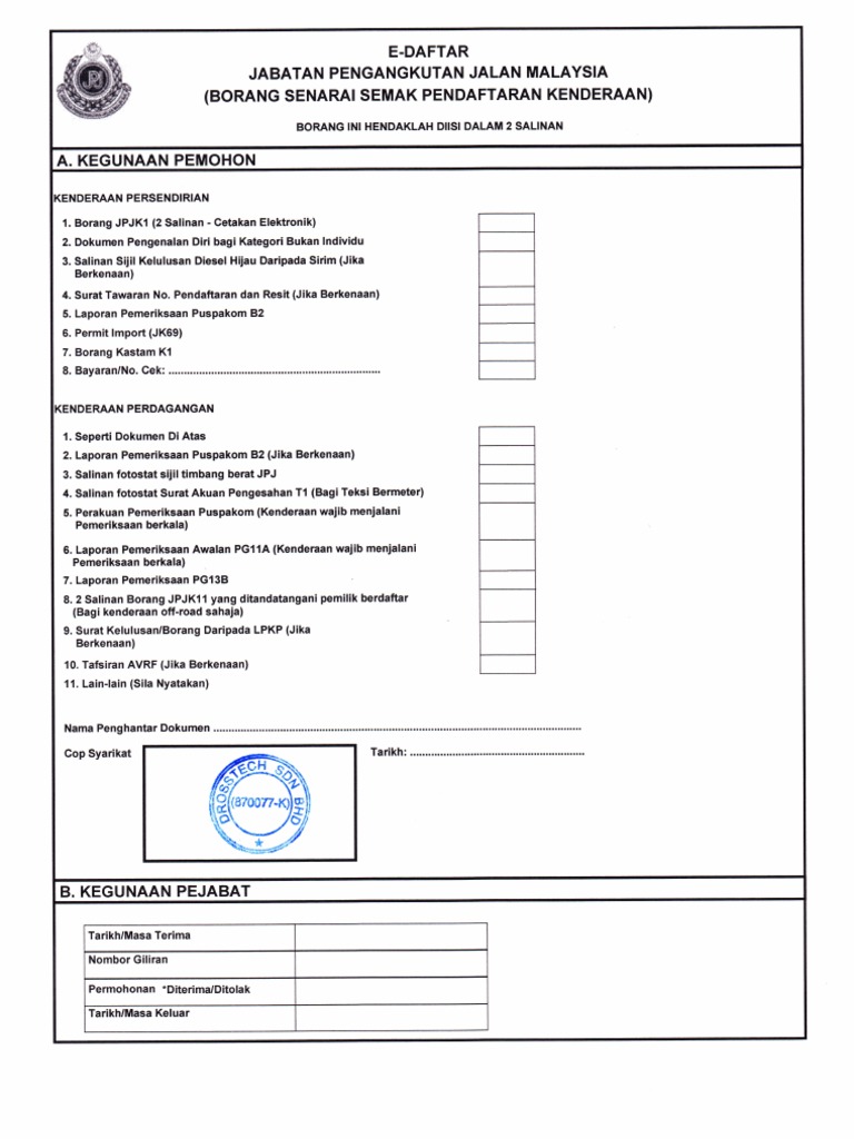 Borang senarai semak jpj. Borang senarai semak permohonan vta. Cara daftar ekasih dan semakan status pendaftaran. 26 jalan tun hussien presint 4 pusat pentadbiran kerajaan persekutuan 62100 wp putrajaya 60 3 8000 8000 umum 60 3 8881 0194 faks. Semakan status senarai hitam pemandu atau pemilik kenderaan yang disaman atau diberi notis tetapi tidak membayar kompaun dalam masa 60 hari akan dirujuk ke mahkamah.