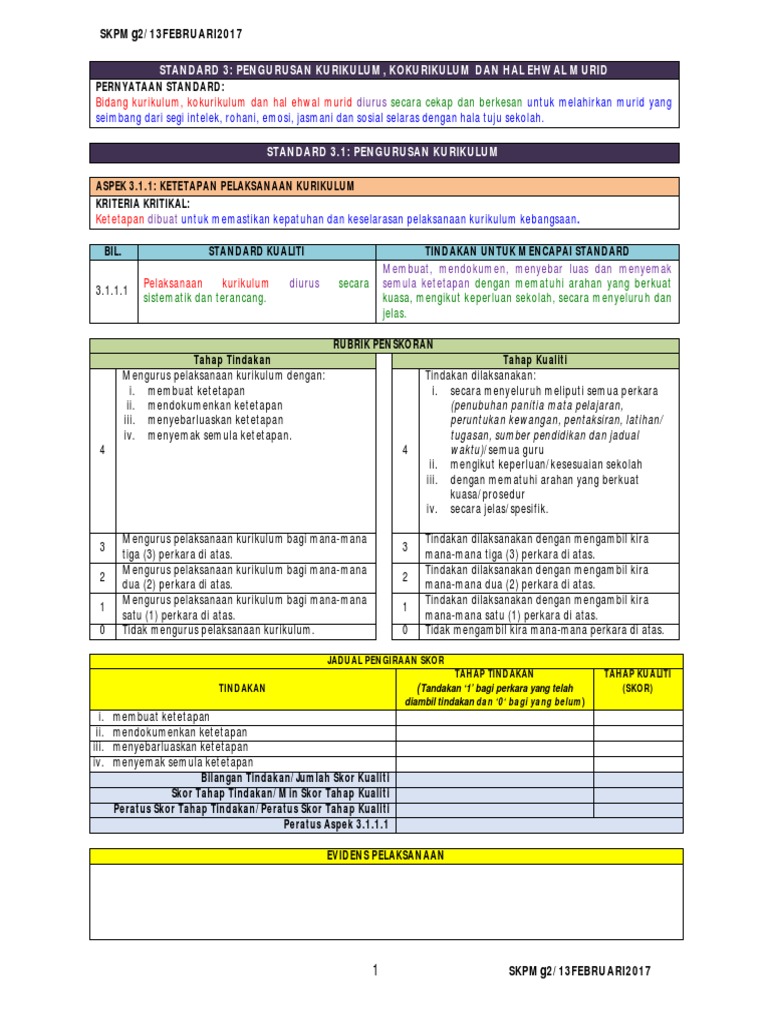 Berikut adalah borang skor bagi pencerapan pdpc yang akan dibuat oleh guru sendiri dan pentadbir sekolah. Skpmg2 ataupun standard kualiti pendidikan malaysia gelombang 2 merupakan penggubalan semula skpm 2010 dengan penambahbaikan dan peningkatan kualiti pada beberapa standard seperti aspek kepimpinan pengurusan organisasi pengurusan kurikulum kokurikulum dan hal ehwal murid pembelajaran dan pemudahcaraan dan kemenjadian murid. 28 3 1 2 pengurusan mata pelajaran. Standard 3 1 pengurusan kurikulum 05 s3 1 pengurusan kurikulum from jasmi jaafar.