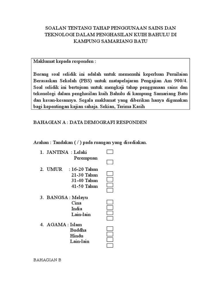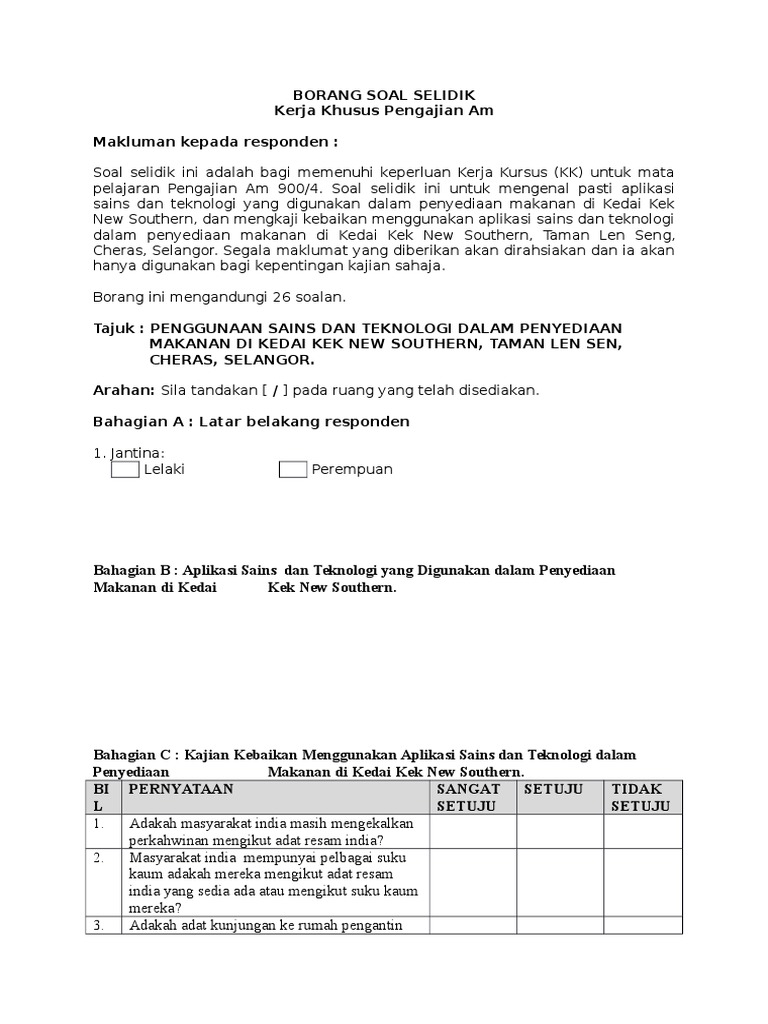 Contoh borang soal selidik sistem pengangkutan geografi. Soal selidik ini bertujuan mengkaji kemudahan di kantin smjk yu hua segala maklumat yang diberikan akan dirahsiakan. Abstrak kajian ini bertujuan mengkaji penggunaan sains dan teknologi dalam penghasilan dan pemasaran biskut tradisional heong peah di kampung valdor sungai jawi pulau pinang. Soal selidik ini bertujuan untuk mengkaji penggunaan sains dan teknologi dalam penghasilan biskut tradisional heong peah di kampung valdor sungai jawi pulau.