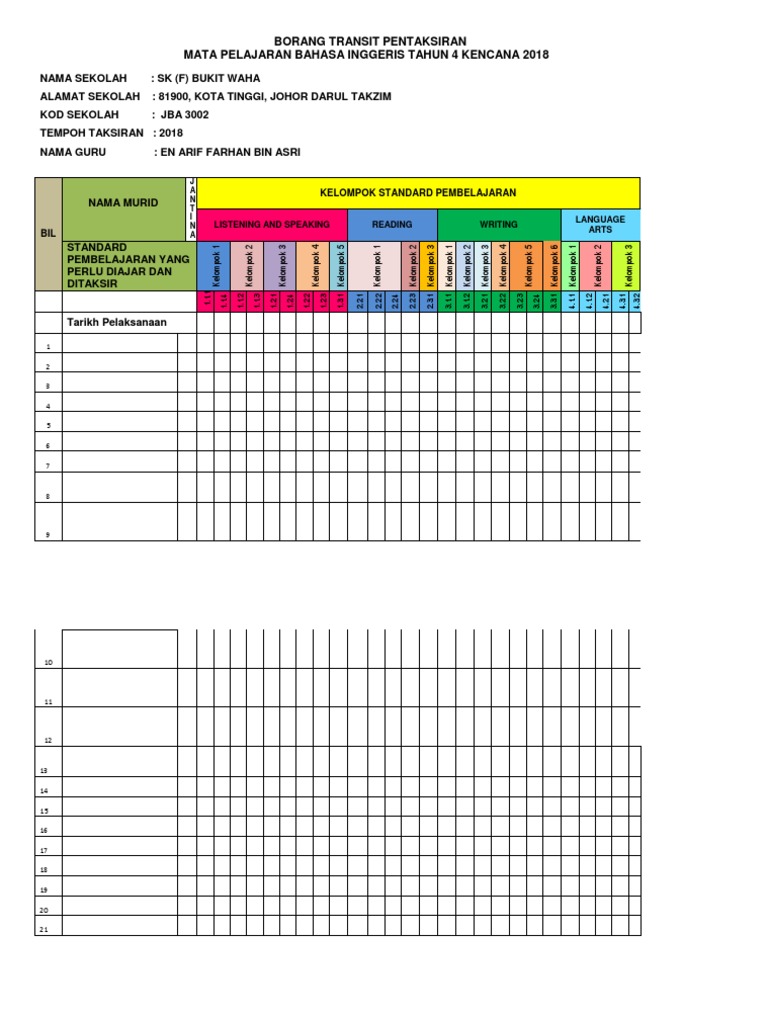 Borang transit pbd bahasa inggeris tahun 1. Bahagian pembangunan kurikulum bpk telah membuat penambahbaikan kepada templat pelaporan pentaksiran bilik darjah pbd tahap 1 bagi semua mata pelajaran kssr semakan 2017. Panduan menggunakan google drive pengisian templat pbd tahap 1 pdf. Pbd pentaksiran bilik darjah dilaksanakan. 10 27 00 am in borang transit pbs kssr checklist kssr english year 1 rekod transit kssr fail di bawah merupakan rekod transit yang boleh digunapakai oleh guru guru yang mengajar mata pelajaran bahasa inggeris tahun 1.