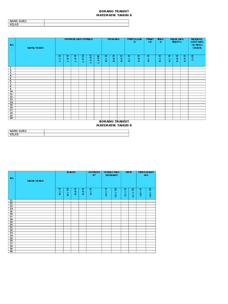 Borang Transit Pbs Matematik Tahun 6