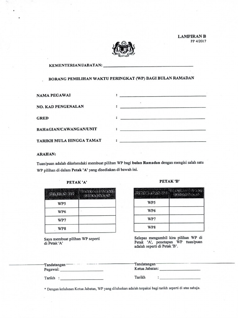 2 18 2019 5 40 16 pm. Pekeliling pendaftar bil 11 tahun 2016 tambahan waktu peringkat wp dalam jadual waktu bekerja wbb sepanjang bulan ramadan di uitm 222 99 kb. Bagi menjamin keberkesanan wbb pegawai hendaklah membuat perancangan wp dengan memilih wp1 atau wp2 atau wp3 yang sesuai setiap bulan bagi setahun dengan menggunakan borang seperti di lampiran tertakluk kepada persetujuan ketua jabatan. Sekiranya ingin mengubah wp yang telah ditetapkan borang baru beserta dengan surat alasan hendaklah dikemukakan bagi tujuan kelulusan ketua jabatan wbb jld 1.
