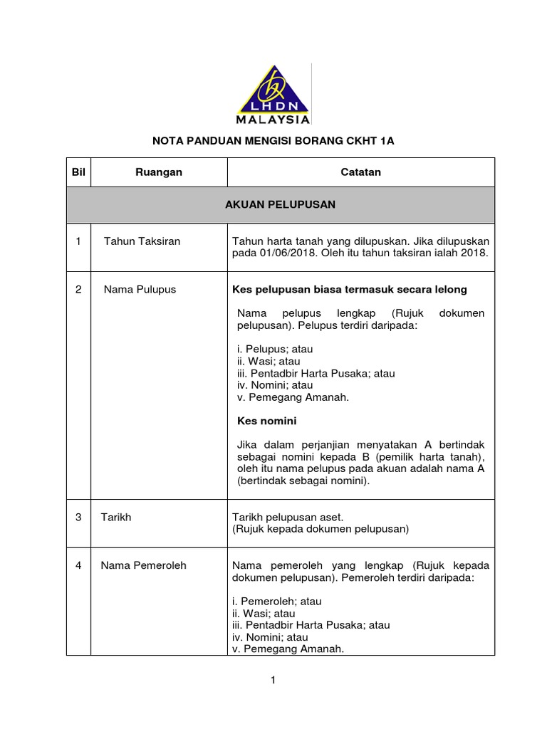 Cara isi borang ckht 1a. Jika dilupuskan pada 01 06 2020. Pertama korang bayar melalui peguam yang uruskan penjualan rumah tersebut. Nota panduan mengisi borang ckht1a bil ruangan catatan akuan pelupusan 1 tahun taksiran tahun harta tanah yang dilupuskan. Available in malay language only.