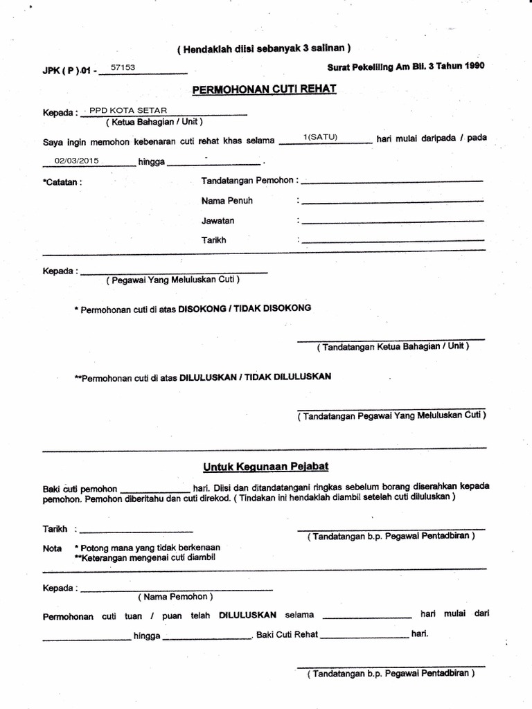 Contoh borang cuti ringkas. Pemohon telah diberitahu dan cuti telah direkod. 0 0 mendukung tandai dokumen ini sebagai bermanfaat 0 0 menolak tandai dokumen ini sebagai tidak bermanfaat tanamkan. Baki cuti pemohon hari. Permohonan cuti rehat am 42 pin.