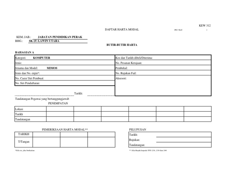 Contoh borang daftar harta modal kew 312. Pa 2 keadaaan harta modal catatan mengikut rekod sebenar lengkap kemaskini ya tidak ya tidak 1. Vet 4093 pengurusan stor harta modal inventori3 0 kew 312 a kad penyenggaraan harta modal kew 312 a butir butir penyelenggaraan harta modal kementerian jabatan. Jenis harta modal lokasi daftar kew. Mesin fotostat fuji no.
