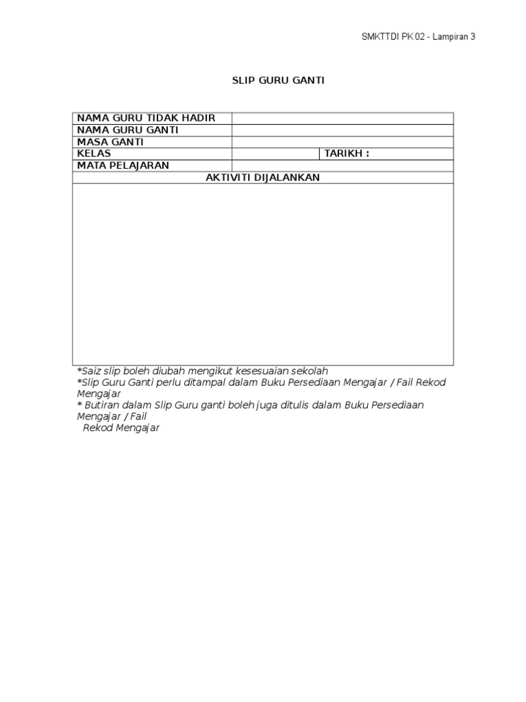 Contoh borang guru ganti kelas. Keutamaan kelas ganti akan diberikan kepada pelajar berikut. Kelas ganti akan diberikan atas pertimbangan pihak alfa genius sdn bhd. Borang ssqs 2 0 murid borang ssqs 2 0 guru contoh memohon sumbangan perkhidmatan menyediakan. The file extension pdf and ranks to the documents category.
