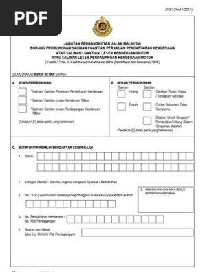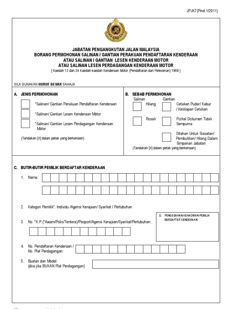 Borang permohonan lesen vokasional jpj l8a sebelum lampiran a1 borang permohonan ujian undang undang jalan raya bahagian i lisan agi calon buta huruf seterus info korporat pada 1 april 1946 jabatan pengangkutan jalan telah ditubuhkan yang bertujuan menyelaras segala aspek berkaitan pengangkutan bagi seluruh negeri. In bahasa malaysia the document is known as borang permohonan pendataran kenderaan motor. Download jpj k1 form motor vehicle registration form the jabatan pengangkuatan jalan jpj k1 form has to be filled if you are planning to register a motor vehicle in malaysia. 26 jalan tun hussien presint 4 pusat pentadbiran kerajaan persekutuan 62100 wp putrajaya 60 3 8000 8000 umum.