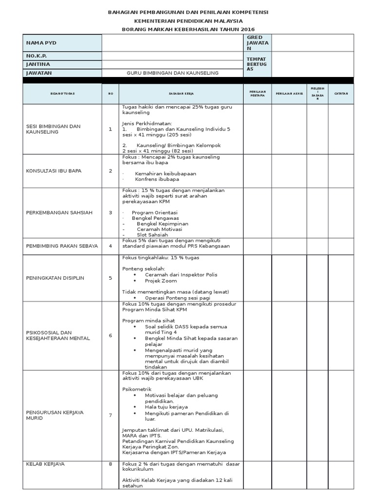 Panduan panduan untuk guru guru penolong kanan guru besar dan pengetua guru akademik biasa boleh juga diperoleh di pautan ini. Contoh sasaran keberhasilan ini disediakan untuk membantu pegawai pp dan juga pegawai yang dinilai pyd yang terdiri daripada pegawai perkhidmatan pendidikan ppp merangka penulisan sasaran keberhasilan mengikut bidang tugas dan sasaran yang akan dicapai dalam satu tempoh penilaian semasa. Borang bk 2 borang biodata guru bimbingan dan kaunseling sekolah rendah borang bk 4 borang biodata murid borang bk 5 borang khidmat kaunseling individu. Sila gunakan template borang keberhasilan ini.