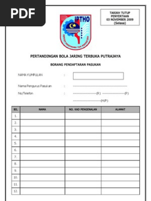 Contoh borang pendaftaran bola jaring. Borang pendaftaranpertandingan bola jaring perempuan bawah 18 tahun. 4 4 upvotes 0 0 downvotes. Kertas kerja kejohanan bola jaring 2013 1. Save save borang pemarkahan perlawanan permainan bola jaring for later.