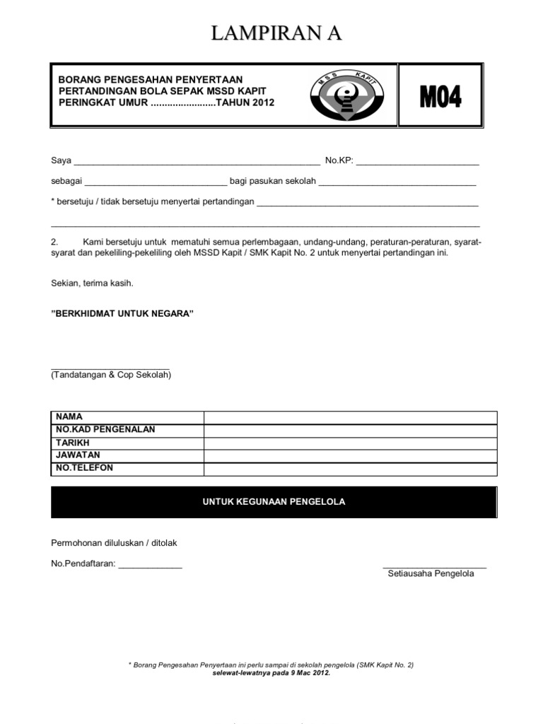 Contoh borang pendaftaran bola sepak. 1 mengisi formulir pendaftaran sekolah sepak bola mattoanging makassar 2 meyerahkan foto copy akta kelahiran kartu keluarga 1 lembar pas foto 2x3 cm 2 lembar 3 membayar uang pendaftaran rp 300 000. Borang borang yang perlu dimuat turun borang pendaftaran pasukan senarai regu borang r01 rendah borang m01 menengah pastikan nama pasukan yang diwakili dalam r01 m01 mesti ditulis mss selangor contoh borang r01 yang telah diisi lengkap. Unknown lihat profil lengkap saya. Dan uang iuran awal rp 30 000 atau total rp 330 000.