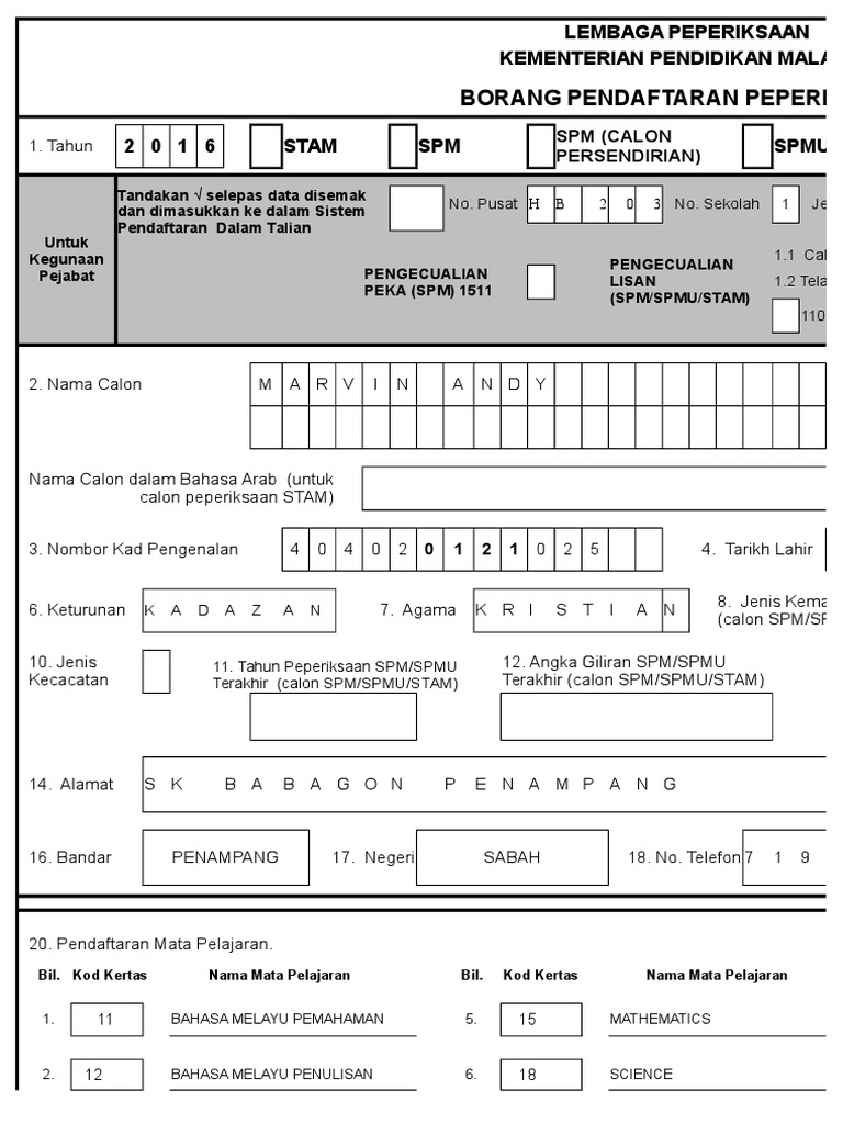 Contoh Borang Pendaftaran Darjah 1