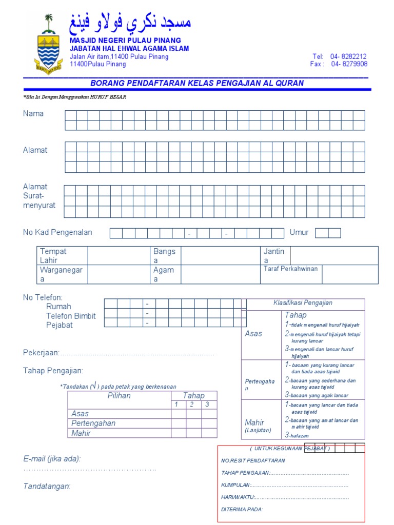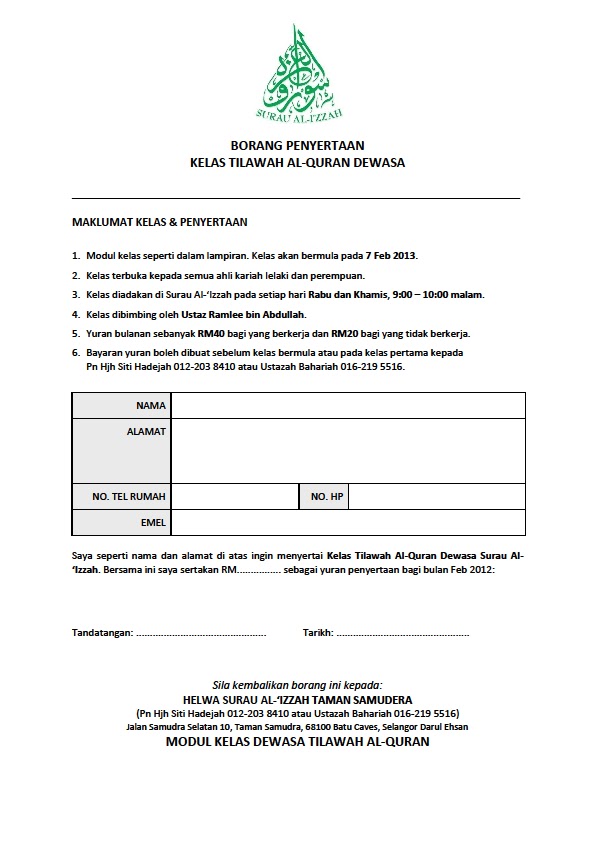Contoh borang pendaftaran kelas al quran. Kelas kelas pengajaran pembelajaran bahasa arab dan inggeris di kuis. Kita terpaksa mengenakan yuran kerana pusat pembelajaran ini bukanlah pusat hasil wakaf dan derma. Tahniah anda memilih untuk mempelajari al quran. Kelas ini tidak menjaminkan anda namun pihak kami telah menyediakan modul modul yang sebaiknya untuk anda.