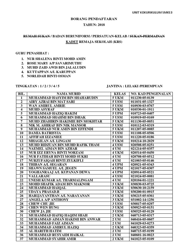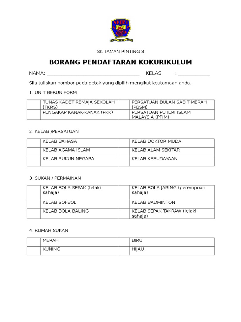 Contoh borang pendaftaran kokurikulum. Surat perlantikan guru penasihat. Borang ssqs 2 0 murid borang ssqs 2 0 guru contoh memohon sumbangan perkhidmatan menyediakan. Pendaftaran tahun satu esppsel https esppsel moe gov my. B pastikan semua pelajar mendaftar dalam ketiga tiga komponen kokurikulum.