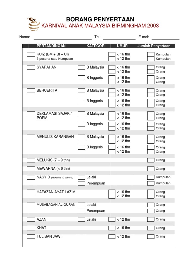 Borang permohonan cuti hendaklah diisi dalam 2 salinan dan dihantar 5 minggu sebelum tarikh mohon cuti contoh surat iringan permohonan cuti. Borang pendaftaran dan penyertaan pertandingan melukis dan mewarna pengakuan ibu bapa atau penjaga maklumat peserta tanda p jika bukan ahli saya telah membaca dan memahami syarat syarat penyertaan yang disertakan bersama. 03 7873 0636 emel. Alat mewarna dan melukis perlu dibawa sendiri.