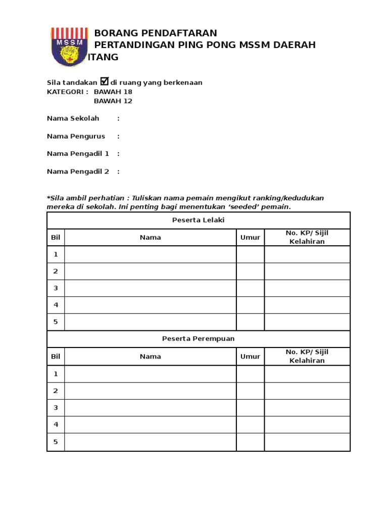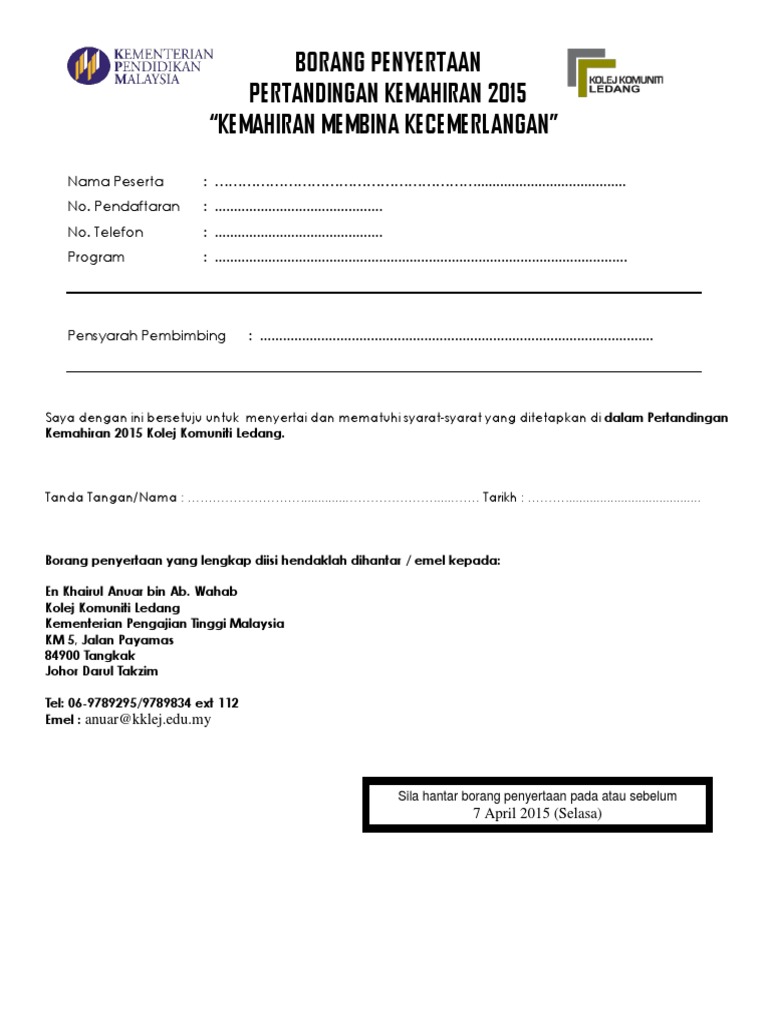 Contoh borang pendaftaran pertandingan. Borang pendaftaran dan penyertaan pertandingan melukis dan mewarna pengakuan ibu bapa atau penjaga maklumat peserta tanda p jika bukan ahli saya telah membaca dan memahami syarat syarat penyertaan yang disertakan bersama. Yuran penyertaan bagi peserta karaoke adalah rm5 00 seorang dan pembayaran boleh dibuat semasa pendaftaran peserta di hari pertandingan sebarang kemusykilan atau masalah dalam melengkapkan borang ini sila hubungi terus en. Borang pertandingan nyanyian berkumpulan nama kumpulan. Keputusan juri hakim adalah muktamad dan sebarang bantahan tidak akan dilayan.