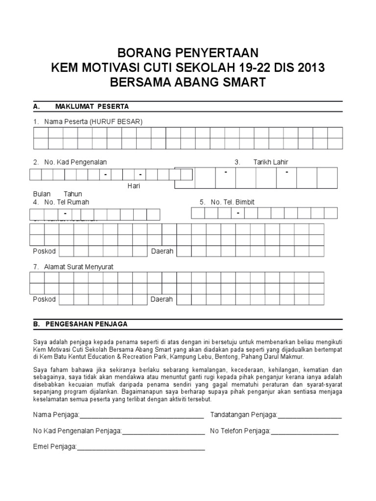 Contoh borang pendaftaran program cuti sekolah. Nama penuh no sijil lahir nama dan alamat sek. Cute blogger share to. Borang permohonan cuti hendaklah diisi dalam 2 salinan dan dihantar 5 minggu sebelum tarikh mohon cuti contoh surat iringan permohonan cuti. 6 18 tahun harian umur.