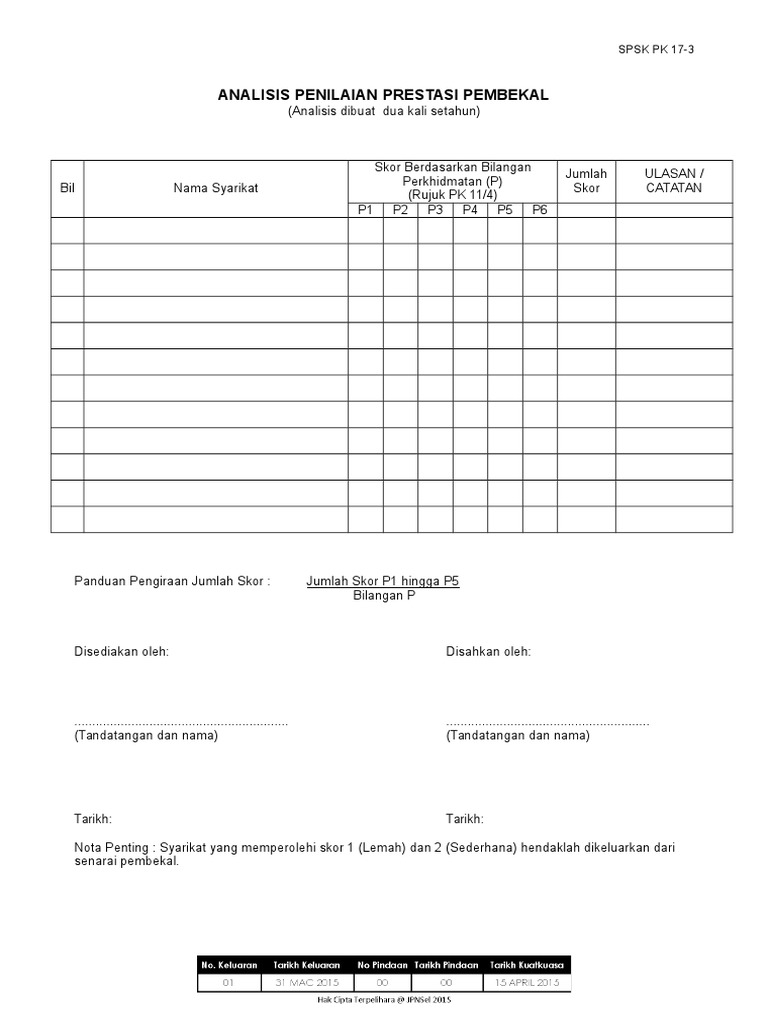 Contoh borang penilaian prestasi pembekal. 7 6 1 pegawai akan menilai prestasi perkhidmatan dengan mengisi borang penilaian pembekal pada akhir tahun atau apabila setiap kerja ditawarkan telah s sebagaimana lampiran iv. 00 tarikh kuatkuasa 5 gawai perancang pegawai undang. S4646 46 750908 07 5247. Bil prestasi amat memuaskan 90 100.