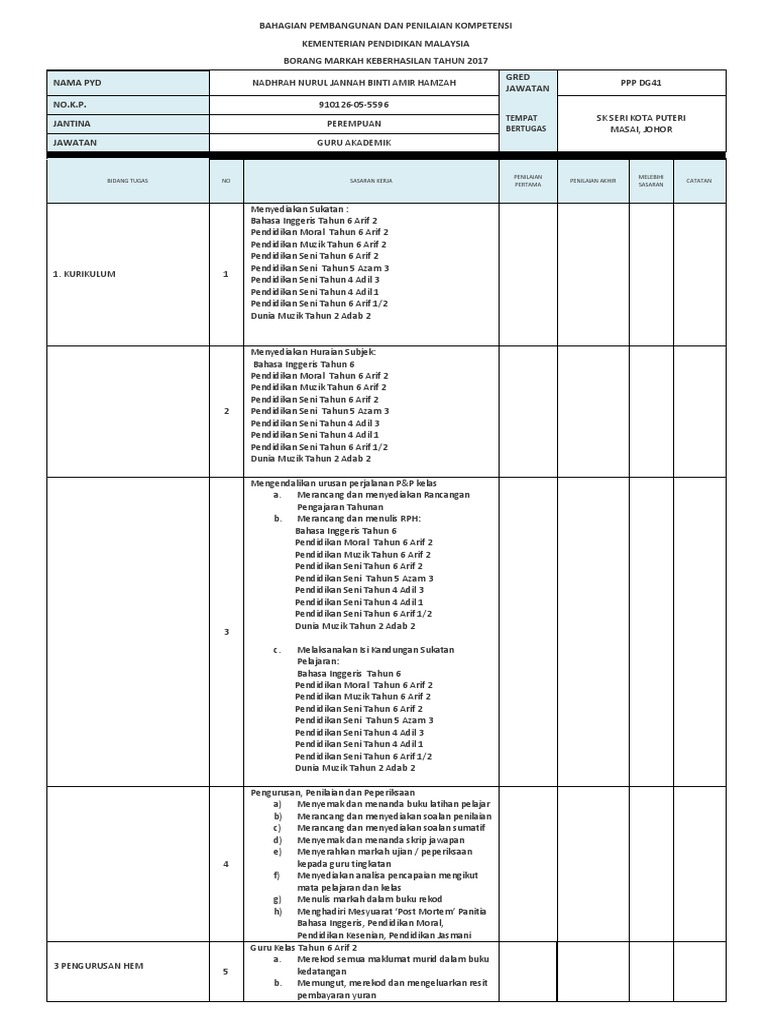 Contoh isi borang markah keberhasilan. Contoh sasaran keberhasilan ini disediakan untuk membantu pegawai pp dan juga pegawai yang dinilai pyd yang terdiri daripada pegawai perkhidmatan pendidikan ppp merangka penulisan sasaran keberhasilan mengikut bidang tugas dan sasaran yang akan dicapai dalam satu tempoh penilaian semasa. Proses penilaian keberhasilan dilaksanakan secara berterusan sepanjang tahun. Borang keberhasilan guru akademik biasa. Bilangan item perlu berbincang dengan penilai pertama dan kedua.