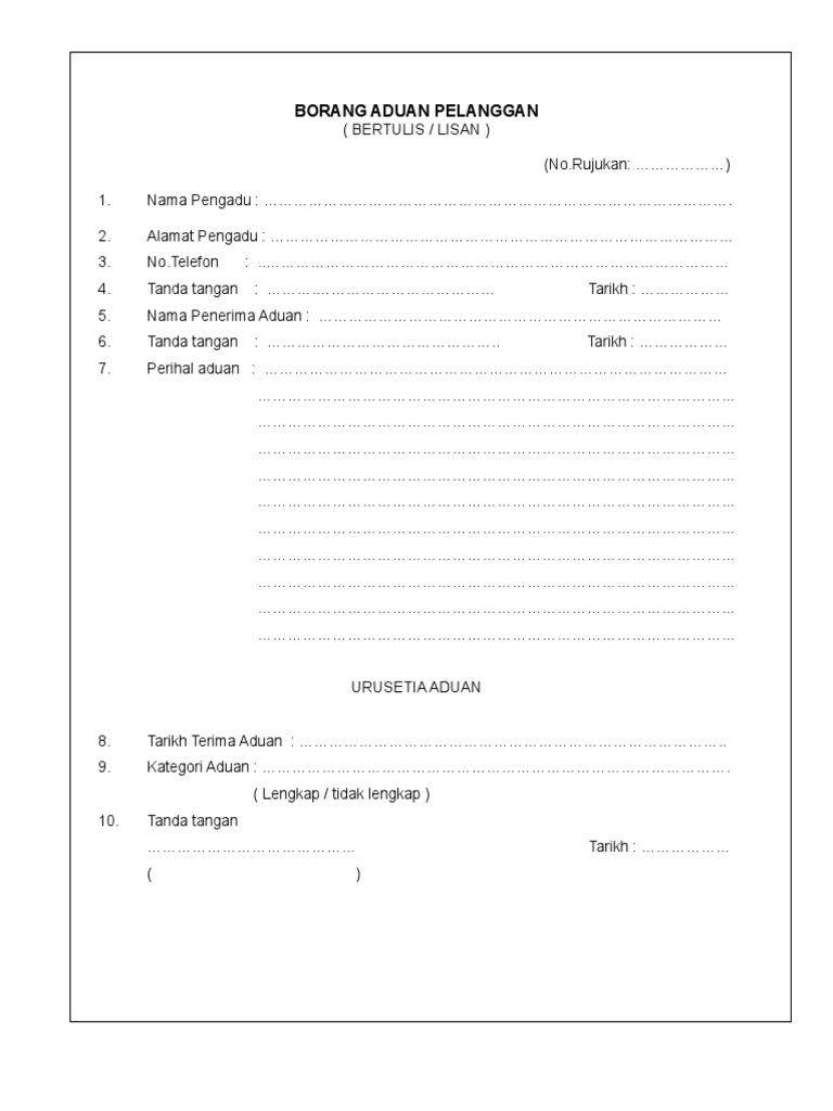 Pastikan maklumat lengkap diisi bagi tujuan tindakan siasatan dan penyampaian maklumat kepada anda. Borang cadangan maklumbalas pelanggan. Pelanggan datang sendiri surat borang dari peti cadangan melalui telefon mel elektronik dialog perjumpaan tertentu media cetak lain lain. Borang maklumbalas aduan pelanggan bahagian kawalan industri customer feedback complaint form for maritime industrial control division sila tanda pada kotak yang berkenaan please tick in the appropriate box nyatakan urusan anda gunakan borang berasingan bagi setiap maklumbalas aduan.