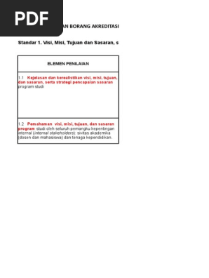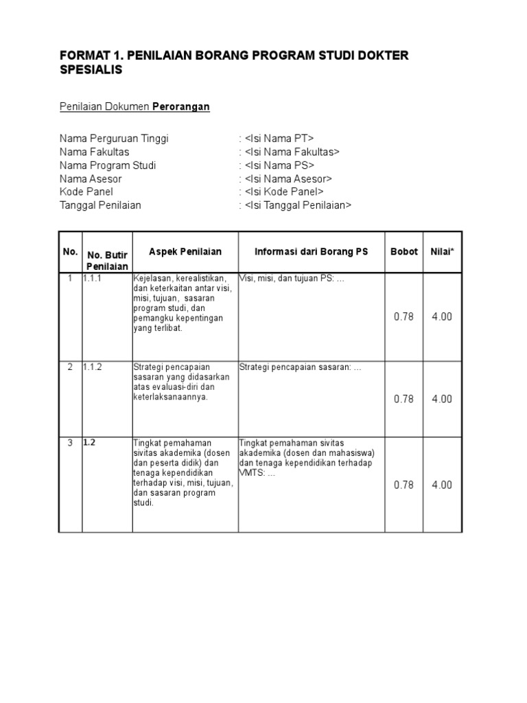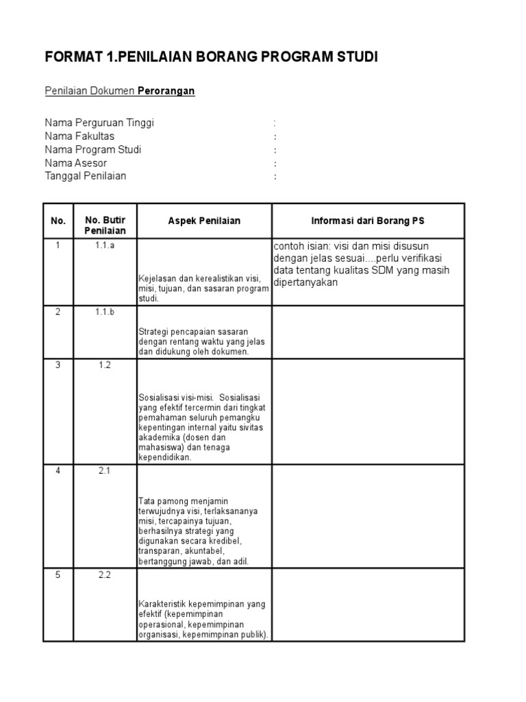 Format penilaian borang program studi. Jenis pendidikan yaitu vokasi akademik profesi b. Program pendidikan yaitu program diploma sarjana. Matriks penilaian borang program studi 1 standar 1 visi misi tujuan dan sasaran serta strategi pencapaian 1 standar 2 tata pamong kepemimpinan sistem pengelolaan dan penjaminan mutu 1 standar 3 mahasiswa dan lulusan 2 standar 4 sumber daya manusia 4 standar 5 kurikulum pembelajaran dan suasana akademik 8. Verifikasi dan penilaian kinerja program studi.