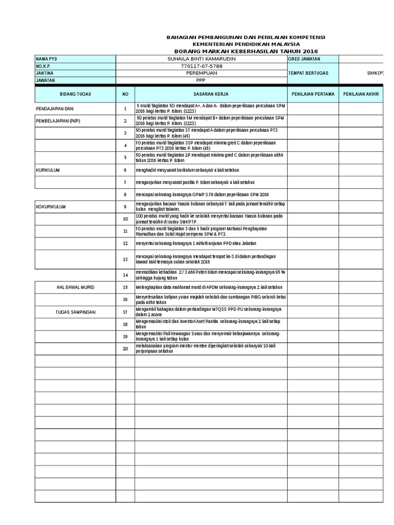 Mycikgu 02 february 26 2020. Panduan pengisian borang keberhasilan guru pendidikan islam. Bahagian pembangunan dan penilaian kompetensi kementerian pendidikan malaysia borang markah keberhasilan tahun 2016 nama pyd rozimah binti mohd halimi gred jawatan dg 44 no k p. Borang keberhasilan ini juga berbeza di antara pentadbiran sekolah dan staf sekolah kerana masing masing mempunyai bahagian tugas yang sendiri.