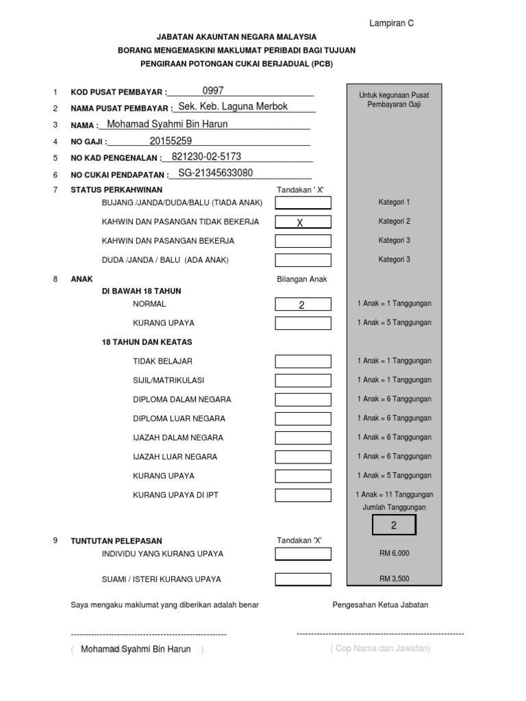 Sila rujuk surat yang disertakan untuk perhatian dan tindakan ptj. 5 status perkahwinan tandakan x bujang kahwin dan pasangan tidak berkerja kahwin dan pasangan bekerja. Walaubagaimanapun hcm ada membuat sedikit pindaan bagi membolehkan borang berkenaan digunakan sepanjang masa selagi tiada. Borang kemaskini maklumat peribadi pcb 2019 kepada semua ptj yang diberi khidmat oleh janm negeri melaka.