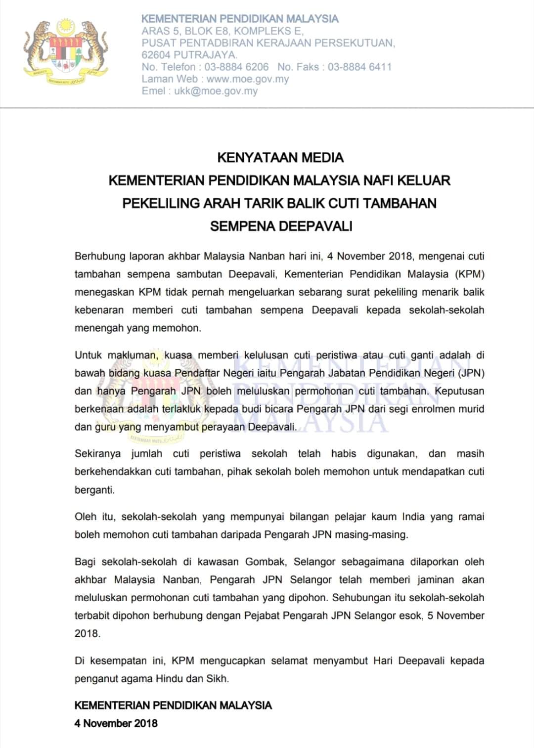 Bagi tahun 2019 ini kpm memperuntukkan tambahan cuti bagi tahun baru cina hari raya aidilfitri dan hari deepavali. Diberikan kemudahan cuti tanpa rekod selama satu 1 hari iaitu pada 7 november 2018 rabu sebagai tambahan kepada cuti umum hari deepavali yang jatuh pada 6 november 2018 selasa. Kementerian pendidikan menegaskan tidak pernah mengeluarkan sebarang surat pekeliling menarik balik kebenaran cuti tambahan sempena deepavali kepada sekolah sekolah menengah yang memohon. Cuti tanpa rekod sempena perayaan hari deepavali keywords.