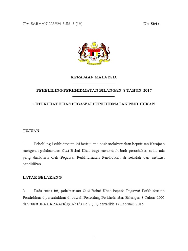 Maklumat hendaklah dilengkapkan dengan jelas dan menggunakan huruf besar. Peningkatan kes hfmd agak membimbangkan negara ketika ini. Presidennya adnan mat berkata langkah itu bagi membolehkan penjawat awam mendapat kemudahan cuti kuarantin sekiranya diri sendiri atau anak anak. Pekeliling perkhidmatan ini bertujuan melaksanakan keputusan kerajaan berkaitan dengan kemudahan cuti kuarantin kepada pegawai perkhidmatan awam persekutuan.