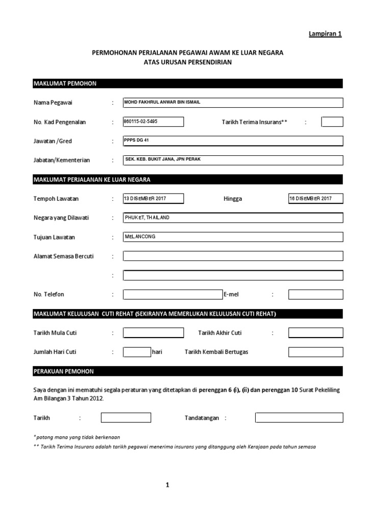Di luar negara tujuan 1. Ke luar negara negara ketiga atas urusan persendirian di bawah pekeliling perkhidmatan bilangan 6 tahun 2015 arahan. Surat pekeliling am bilangan 3 tahun 2012 yang baru itu menetapkan semua pegawai awam yang ingin ke luar negara atas tujuan persendirian perlu mendapatkan kelulusan pegawai tinggi mengikut jawatan dan kategori pegawai. Pekeliling pendaftar bilangan 10 tahun 2017 ctg pegawai yang ikut pasangan bertugas luar negara 204 64 kb 2017 pekeliling pendaftar bilangan 11 tahun 2017 peperiksaan insentif tugas kewangan 48 27 kb.